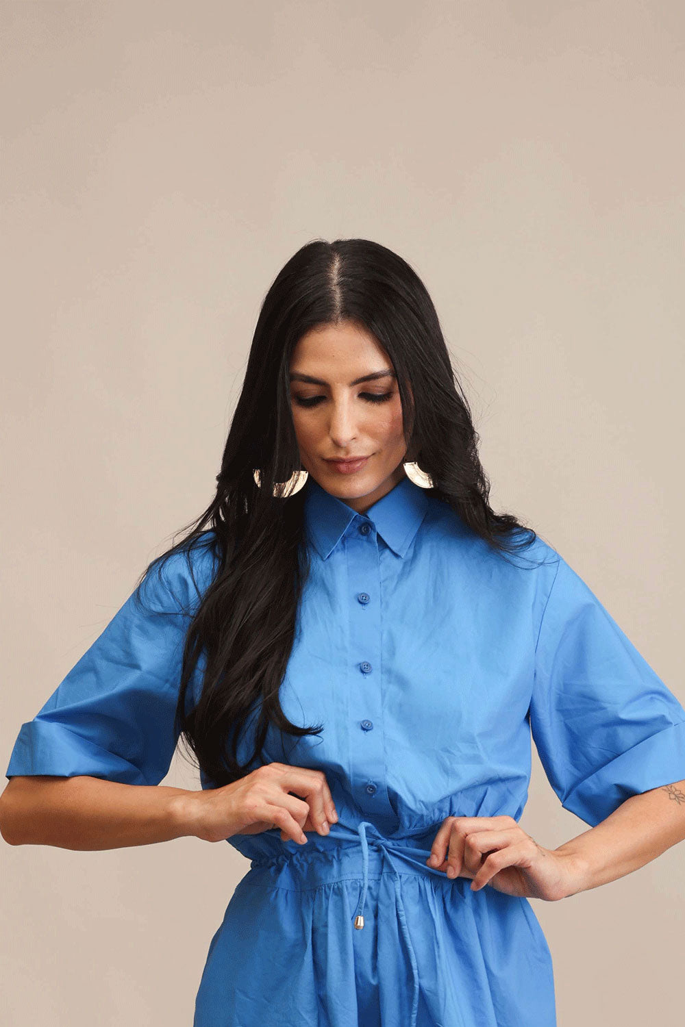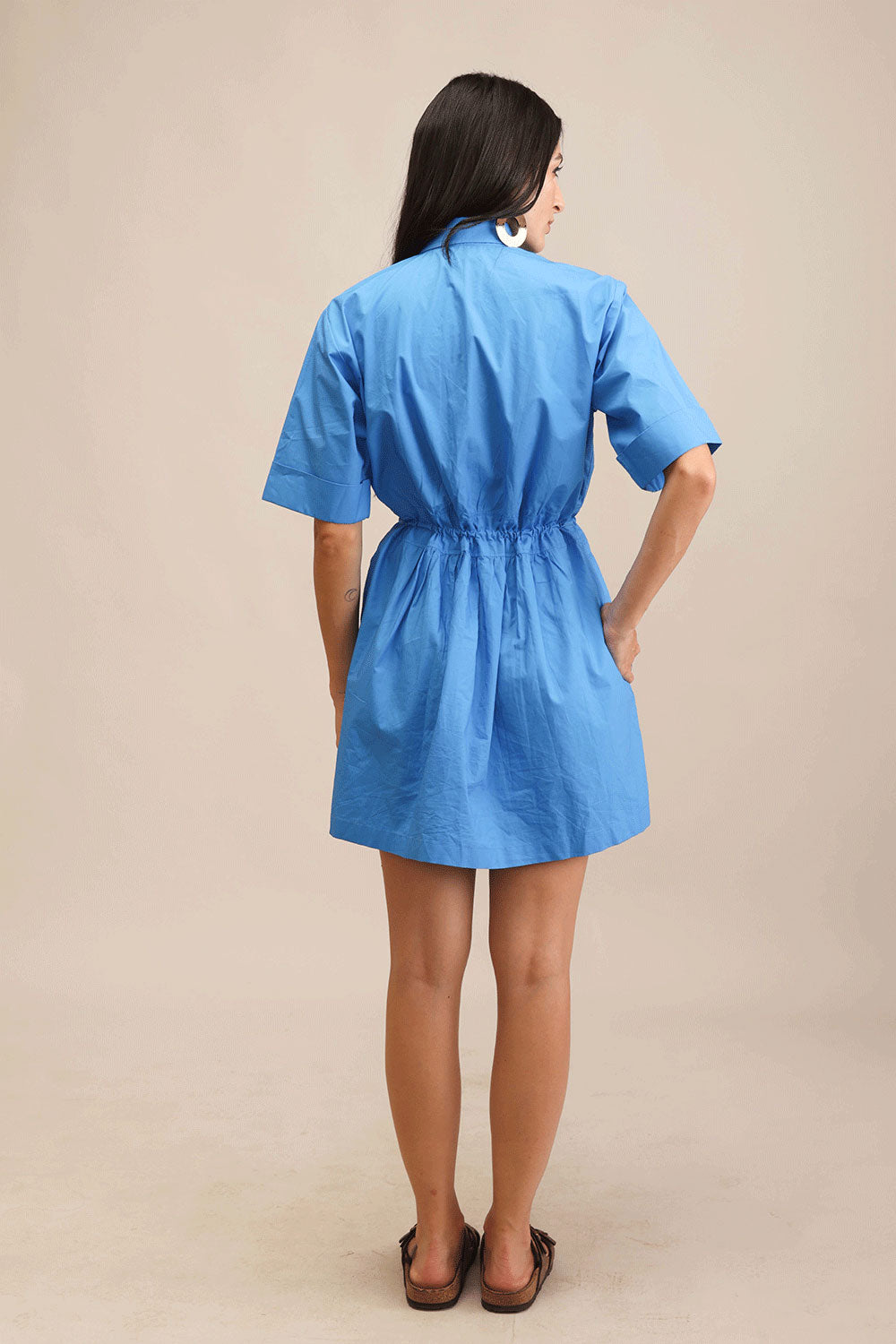 Shirt-collar short dress with elbow-length sleeves featuring a single fold detail and a front button fastening. Designed with an adjustable waist tie to cinch as you like, and finished with functional side pockets. Light, breathable, and perfect for effortless summer days.