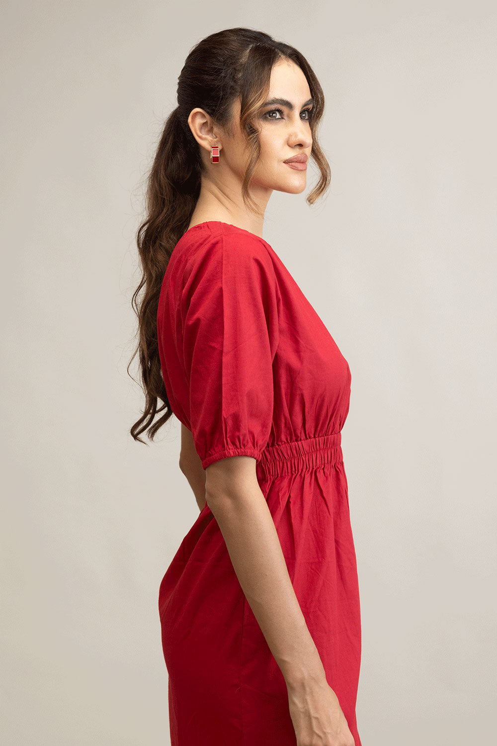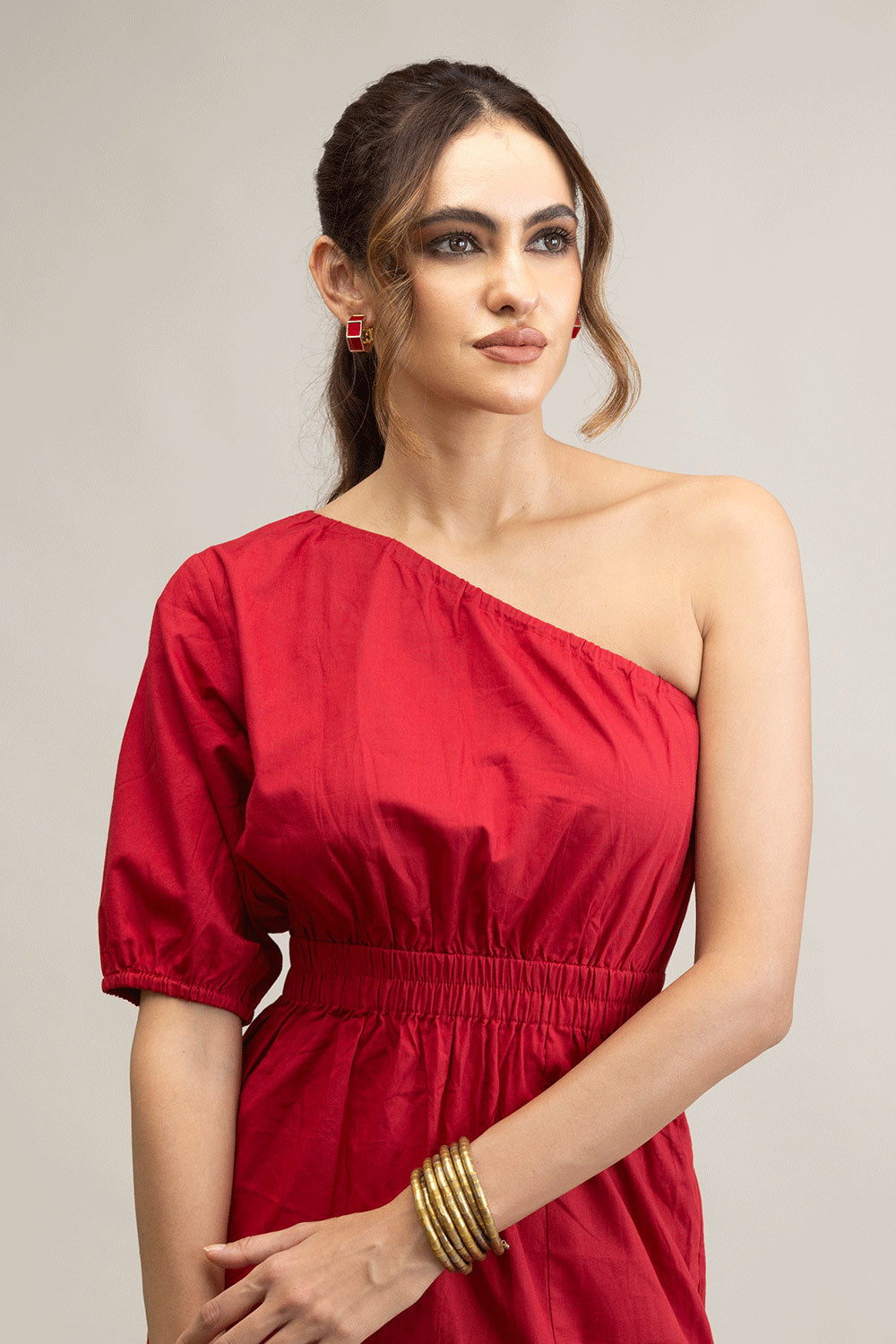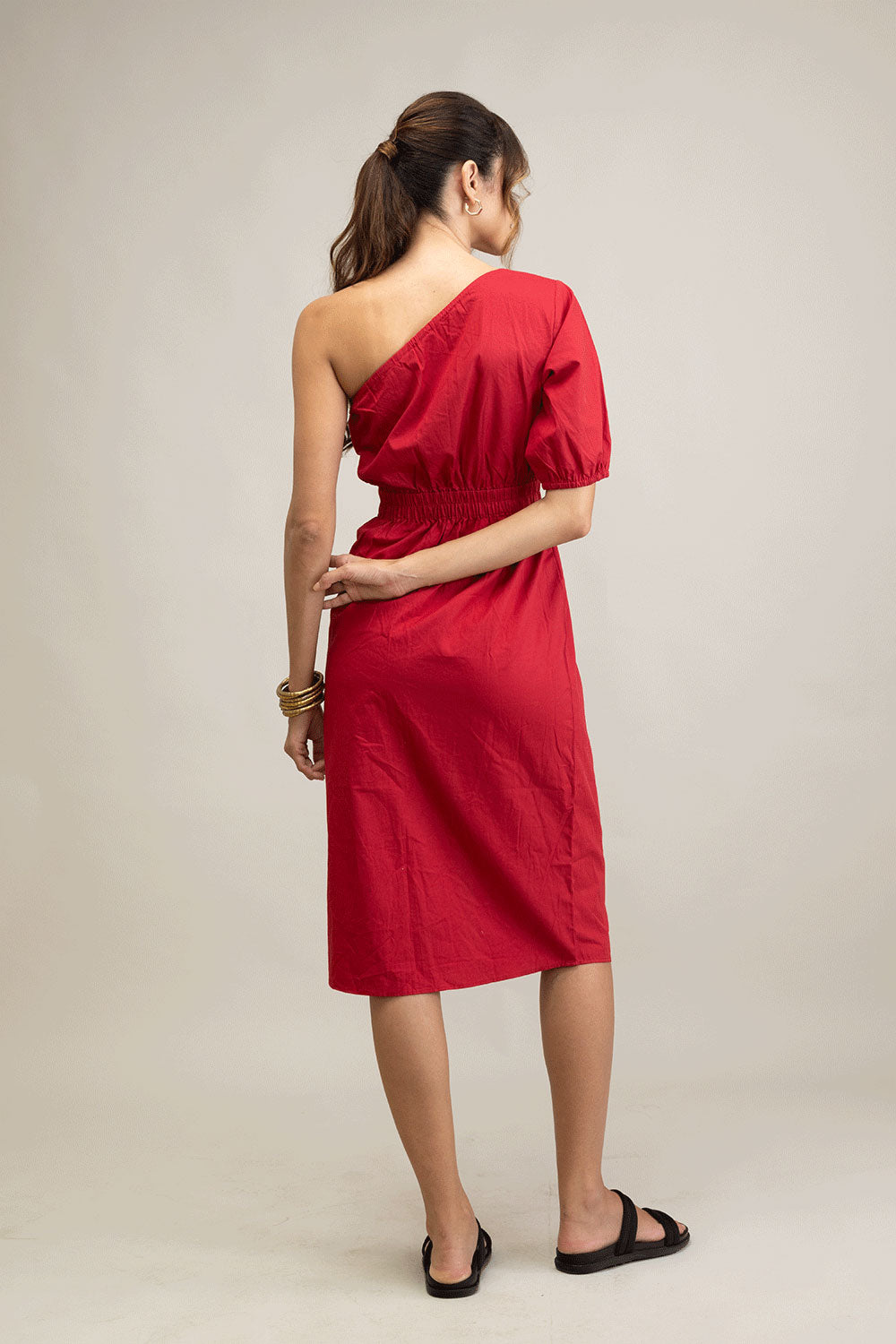 Calf-length dress with an asymmetric neckline and a single statement sleeve. The sleeve sits slightly above the elbow with a subtle puff, while the elasticated waist creates a flattering, defined cinch. Finished with a front side slit for graceful movement and effortless elegance.