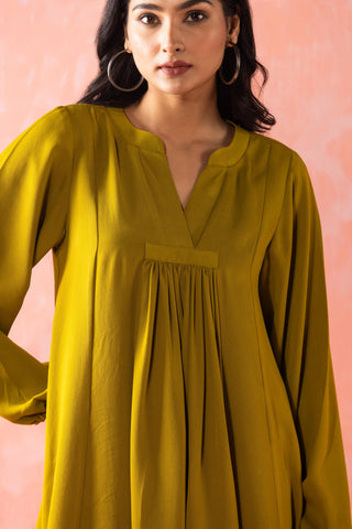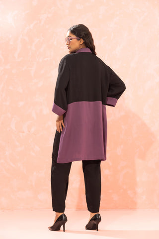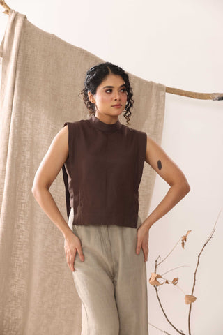 Sleeveless top with high neck and assymetrical collar, button closure on the left shoulder, and a dart detail on the right side. Paired with straight-leg trousers featuring side pockets and a metal hook fastening.